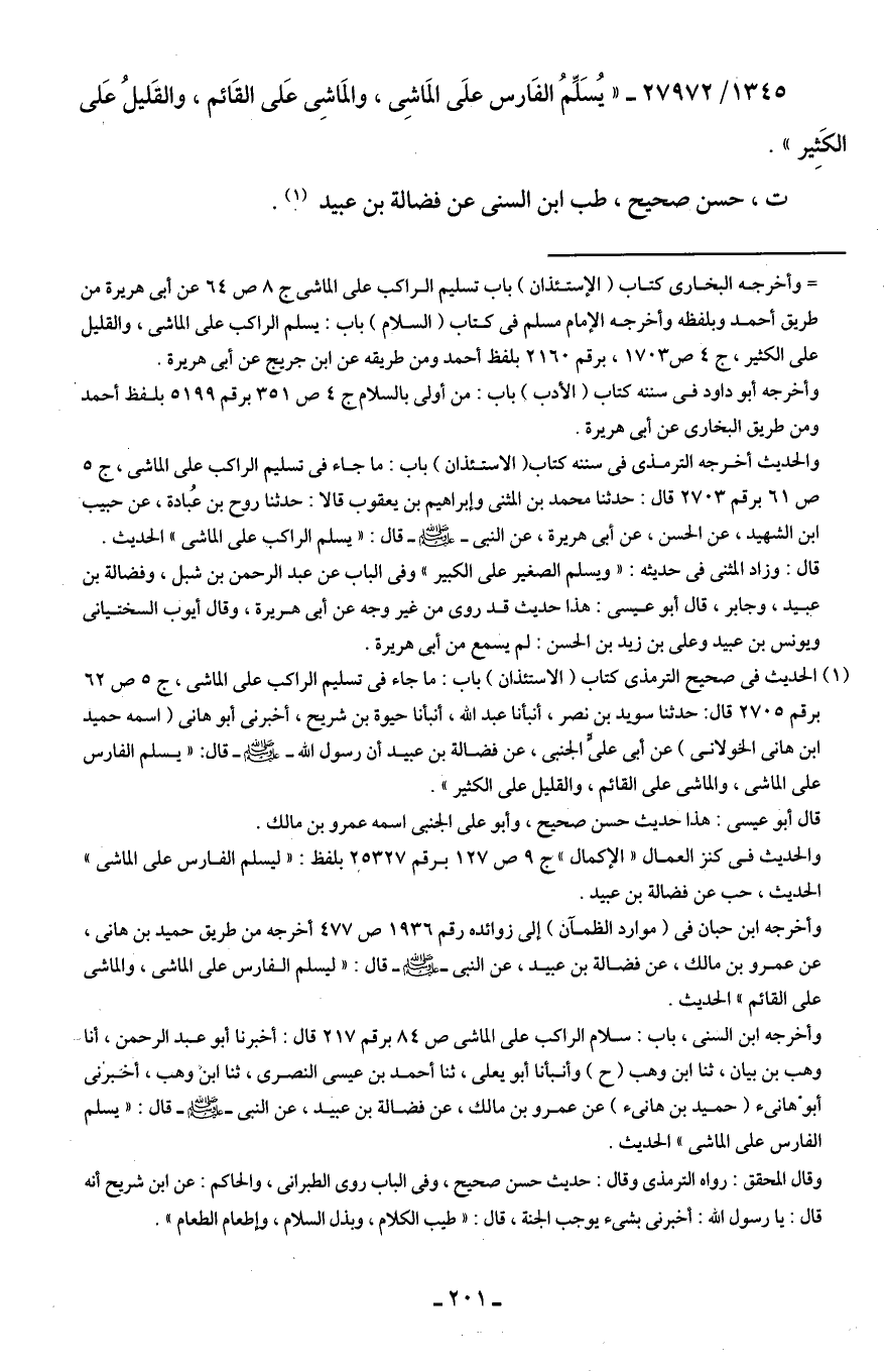 1345/ 27972 - "يُسَلِّمُ الفَارس علَى المَاشِى، والمَاشِى عَلى القَائم، والقَليلُ عَلى الكَثِير".