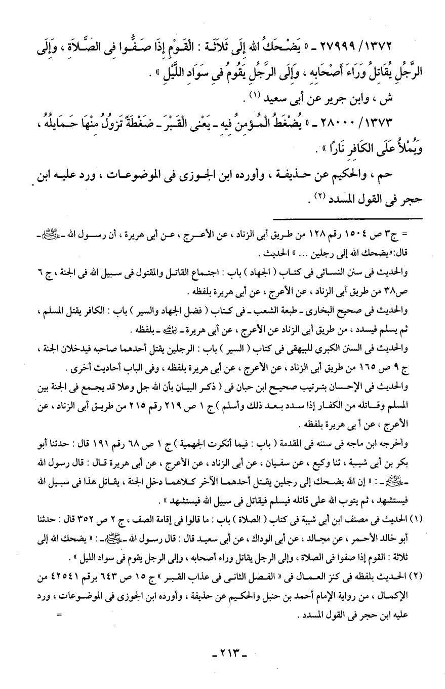 1372/ 27999 - "يَضْحَكُ اللَّه إِلَى ثَلَاثَة: الْقَوْمِ إِذَا صَفُّوا فِى الصَّلَاةِ، وَإِلَى الرَّجُلِ يُقَاتِلُ وَرَاءَ أَصْحَابِهِ، وَإِلَى الرَّجُلِ يَقُومُ فِى سَوَادِ اللَّيْلِ".