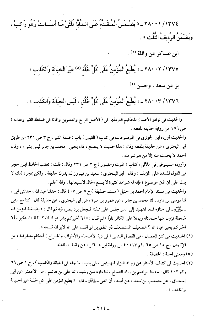1375/ 28002 - "يُطْبَعُ الْمُؤْمِنُ عَلَى كُلِّ خَلَّةٍ (*) غَيْرَ الْخِيَانَةِ وَالْكَذِبِ".