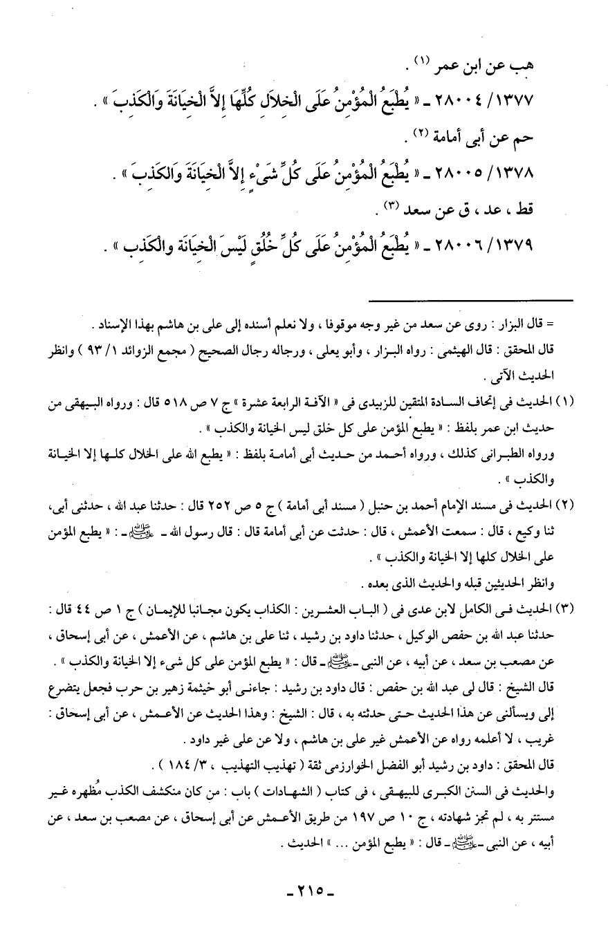 (¬3) الحديث في الكامل لابن عدى في (الباب العشرين: الكذاب يكون مجانبا للإيمان) جـ 1 ص 44 قال: حدثنا عبد اللَّه بن حفص الوكيل، حدثنا داود بن رشيد، ثنا على بن هاشم، عن الأعمش، عن أَبى إسحاق، عن مصعب بن سعد، عن أبيه، عن النبى -صلى اللَّه عليه وسلم- قال: "يطبع المؤمن على كل شئ إلا الخيانة والكذب". قال الشيخ: قال لى عبد اللَّه بن حفص: قال داود بن رشيد: جاءنى أبو خيثمة زهير بن حرب فجعل يتضرع إلى ويسألنى عن هذا الحديث حتى حدثته به، قال: الشيخ: وهذا الحديث عن الأعمش، عن أَبى إسحاق: غريب، لا أعلمه رواه عن الأعمش غير على بن هاشم، ولا عن على غير داود.