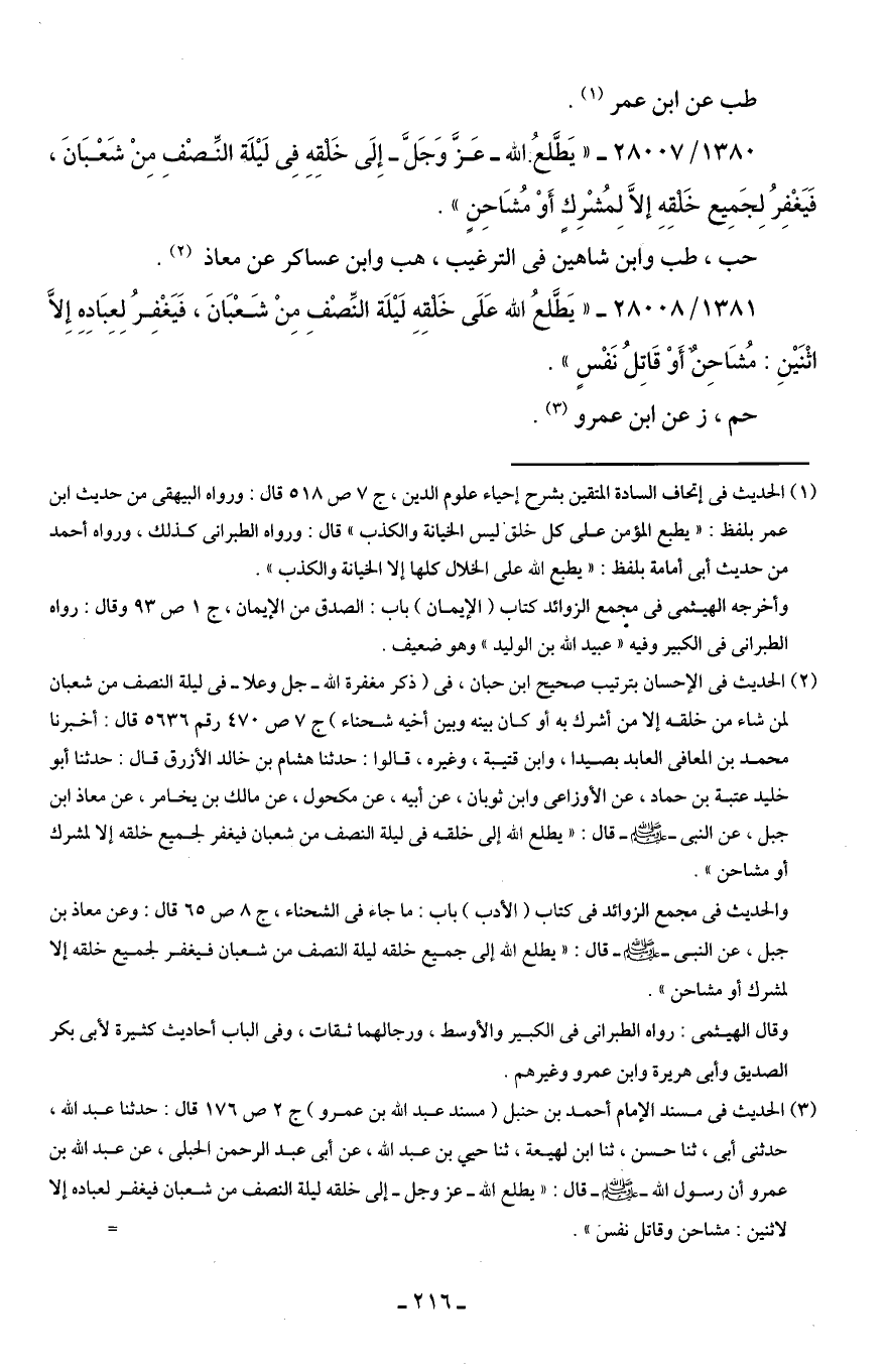1381/ 28008 - "يَطَّلعُ اللَّه عَلَى خَلْقِهِ لَيْلَة النِّصْفِ مِنْ شَعْبَانَ، فَيَغْفِرُ لِعِبَادِهِ إِلَّا اثْنَيْنِ: مُشَاحِنٌ أَوْ قَاتِلُ نَفْسٍ".