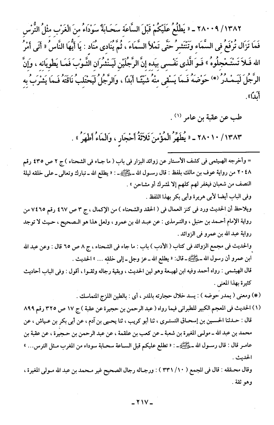 (¬1) الحديث في المعجم الكبير للطبرانى فيما رواه (عبد الرحمن بن حجيرة عن عقبة) جـ 17 ص 325 رقم 899 قال: حدثنا الحسين بن إسحاق التسترى، ثنا أبو كريب، ثنا يحيى بن آدم، عن أَبى بكر بن عياش، عن محمد بن عبد اللَّه -مولى المغيرة بن شعبة- عن كعب بن علقمة، عن عبد الرحمن بن حجيرة، عن عقبة بن عامر قال: قال رسول اللَّه -صلى اللَّه عليه وسلم-: "تطلع عليكم قبل الساعة سحابة سوداء من المغرب مثل الترس. . ." الحديث.