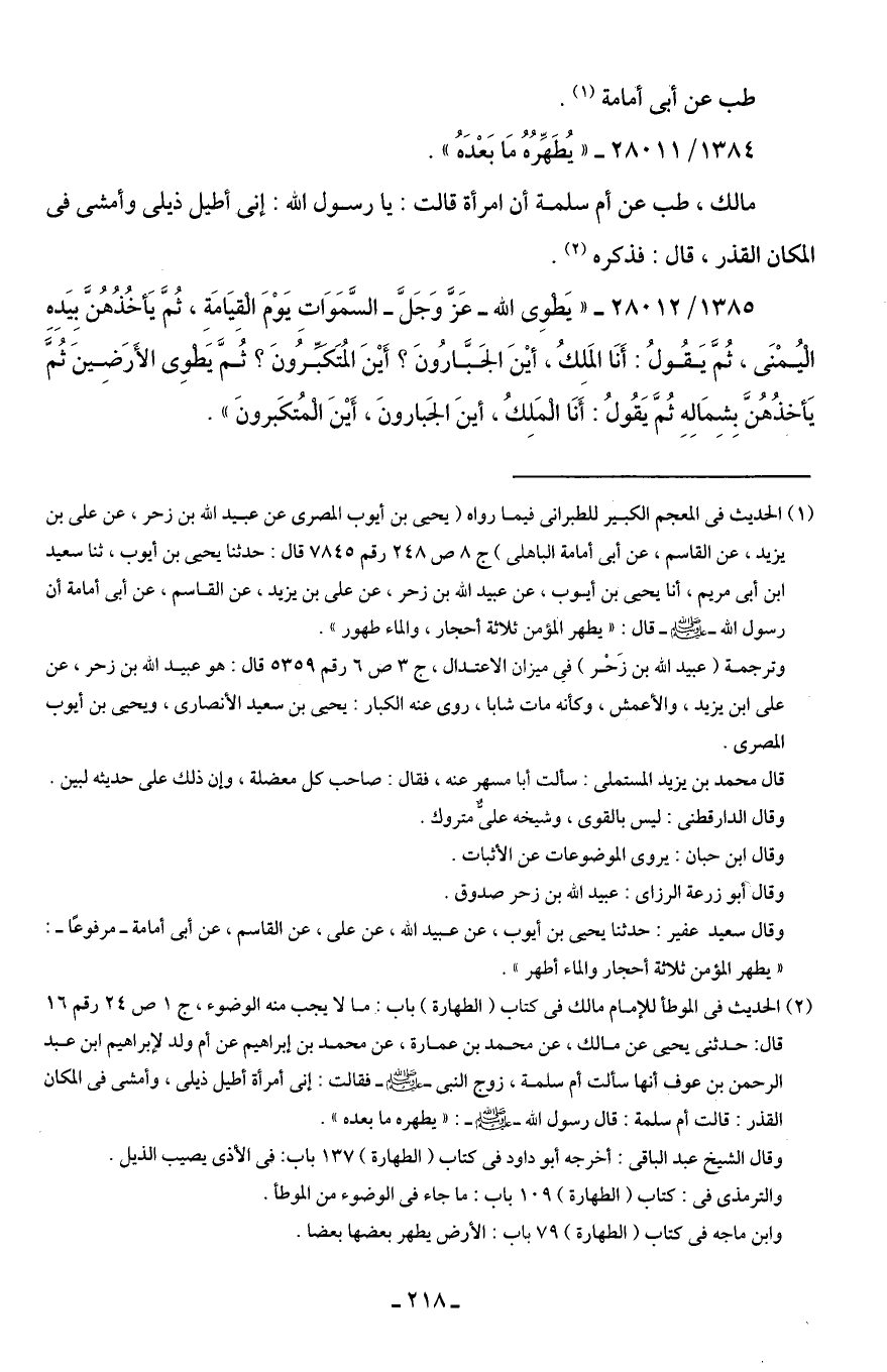 (¬2) الحديث في الموطأ للإمام مالك في كتاب (الطهارة) باب: ما لا يجب منه الوضوء، جـ 1 ص 24 رقم 16 قال: حدثنى يحيى عن مالك، عن محمد بن عمارة، عن محمد بن إبراهيم عن أم ولد لإبراهيم ابن عبد الرحمن بن عوف أنها سألت أُم سلمة، زوج النبى -صلى اللَّه عليه وسلم- فقالت: إنى امرأة أطيل ذيلى، وأمشى في المكان القذر: قالت أُم سلمة: قال رسول اللَّه -صلى اللَّه عليه وسلم-: "يطهره ما بعده".