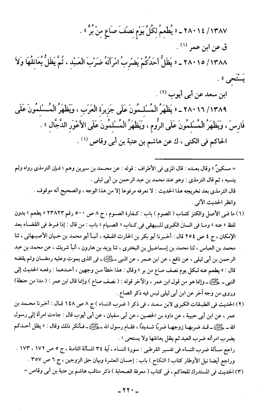 1389/ 28016 - "يَظْهَرُ الْمُسْلِمُونَ عَلَى جَزِيرَةِ الْعَرَبِ، وَيَظْهَرُ الْمُسْلِمُونَ عَلَى فَارِسَ، وَيَظْهَرُ الْمُسْلِمُونَ عَلَى الرُّومِ، وَيَظْهَرُ الْمُسْلِمُونَ عَلَى الأَعْوَرِ الدَّجَّالِ".