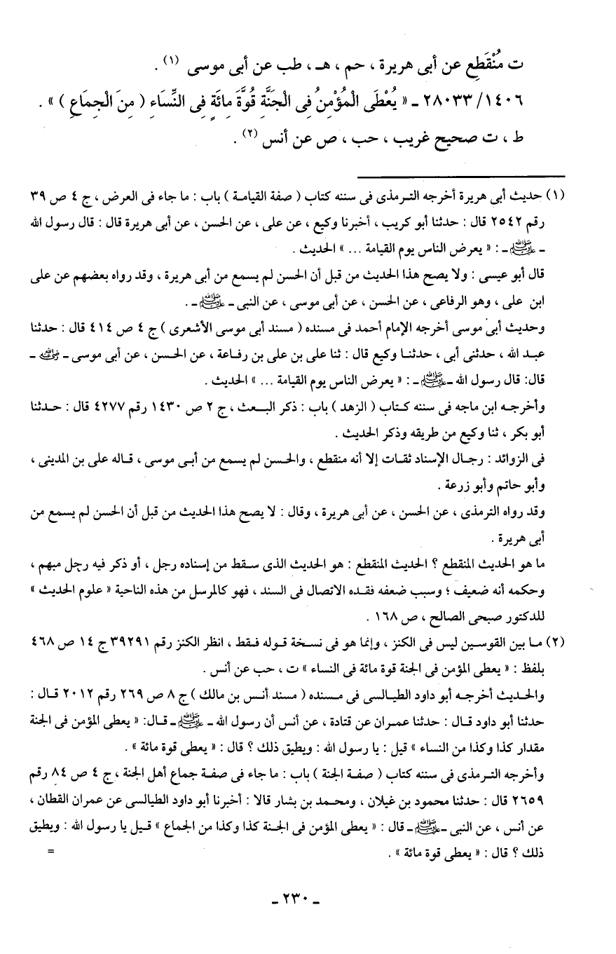 1406/ 28033 - "يُعْطَى الْمُؤْمِنُ فِى الْجَنَّةِ قُوَّةَ مِائَةٍ فِى النِّسَاءِ (مِنَ الْجِمَاعِ) ".