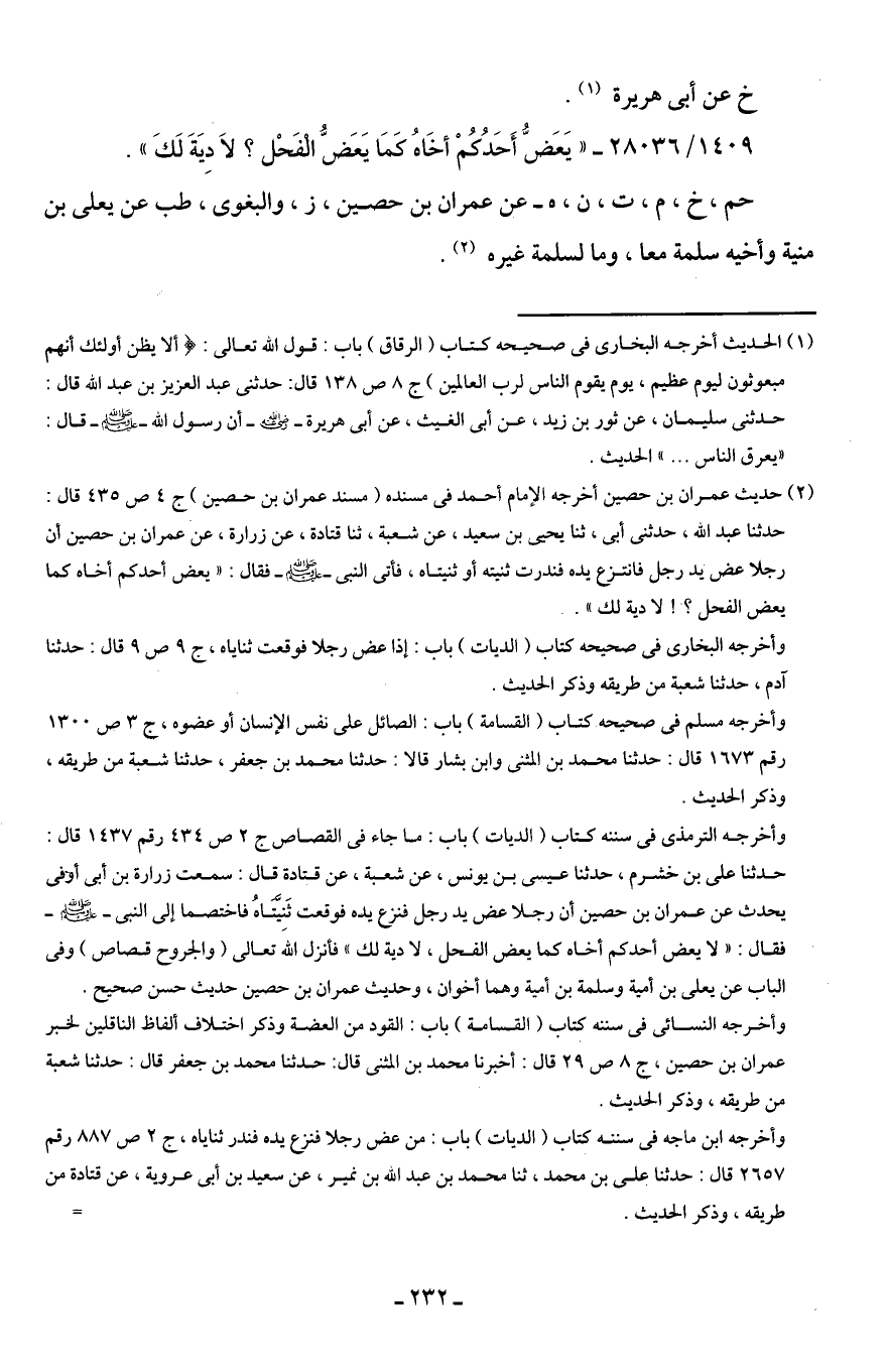 (¬2) حديث عمران بن حصين أخرجه الإمام أحمد في مسنده (مسند عمران بن حصين) جـ 4 ص 435 قال: حدثنا عبد اللَّه، حدثنى أَبى، ثنا يحيى بن سعيد، عن شعبة، ثنا قتادة، عن زرارة، عن عمران بن حصين أن رجلا عض يد رجل فانتزع يده فندرت ثنيته أو ثنيتاه، فأتى النبى -صلى اللَّه عليه وسلم- فقال: "يعض أحدكم أخاه كما يعض الفحل؟ ! لا دية لك".