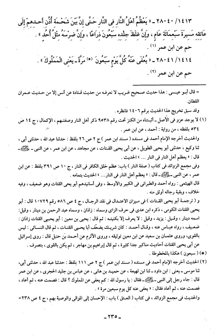 والحديث أخرجه الإمام أحمد في مسنده (مسند ابن عمر) جـ 2 ص 26 بلفظ: حدثنا عبد اللَّه، حدثنى أَبى، ثنا وكيع، حدثنى أبو يحيى الطويل، عن أَبى يحيى القتات، عن مجاهد، عن ابن عمر، عن النبى -صلى اللَّه عليه وسلم- قال: "يعظم أهل النار في النار. . . " الحديث.