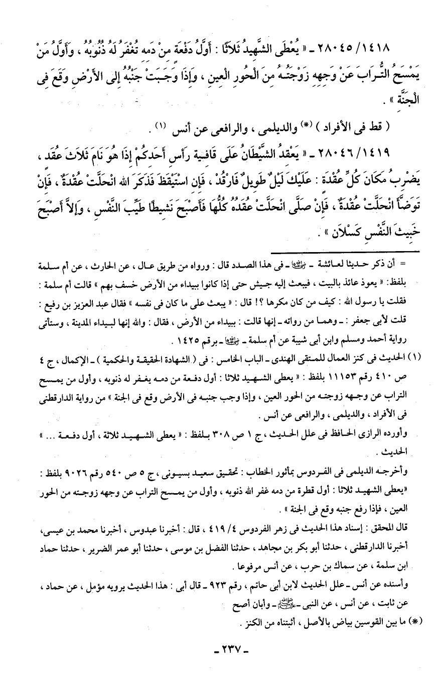 (¬1) الحديث في كنز العمال للمتقى الهندى - الباب الخامس: في (الشهادة الحقيقة والحكمية) - الإكمال، جـ 4 ص 410 رقم 11153 بلفظ: "يعطى الشهيد ثلاثا: أول دفعة من دمه يغفر له ذنوبه، وأول من يمسح التراب عن وجهه زوجته من الحور العين، وإذا وجب جنبه في الأرض وقع في الجنة" من رواية الدارقطنى في الأفراد، والديلمى، والرافعى عن أنس.