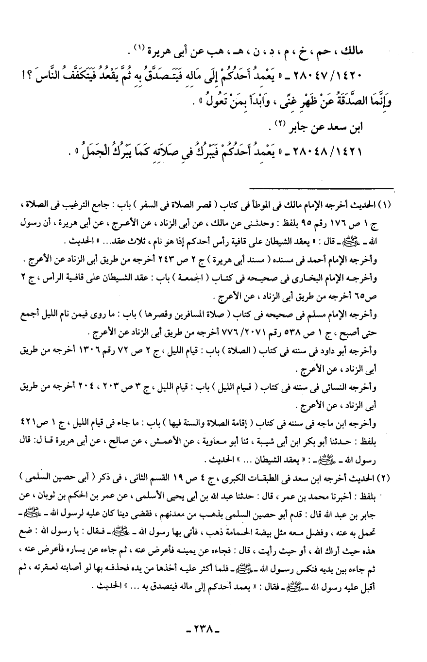 وأخرجه الإمام أحمد في مسنده (مسند أَبى هريرة) جـ 2 ص 243 أخرجه من طريق أَبى الزناد عن الأعرج. وأخرجه الإمام البخارى في صحيحه في كتاب (الجمعة) باب: عقد الشيطان على قافية الرأس، جـ 2 ص 65 أخرجه من طريق أَبى الزناد، عن الأعرج.
