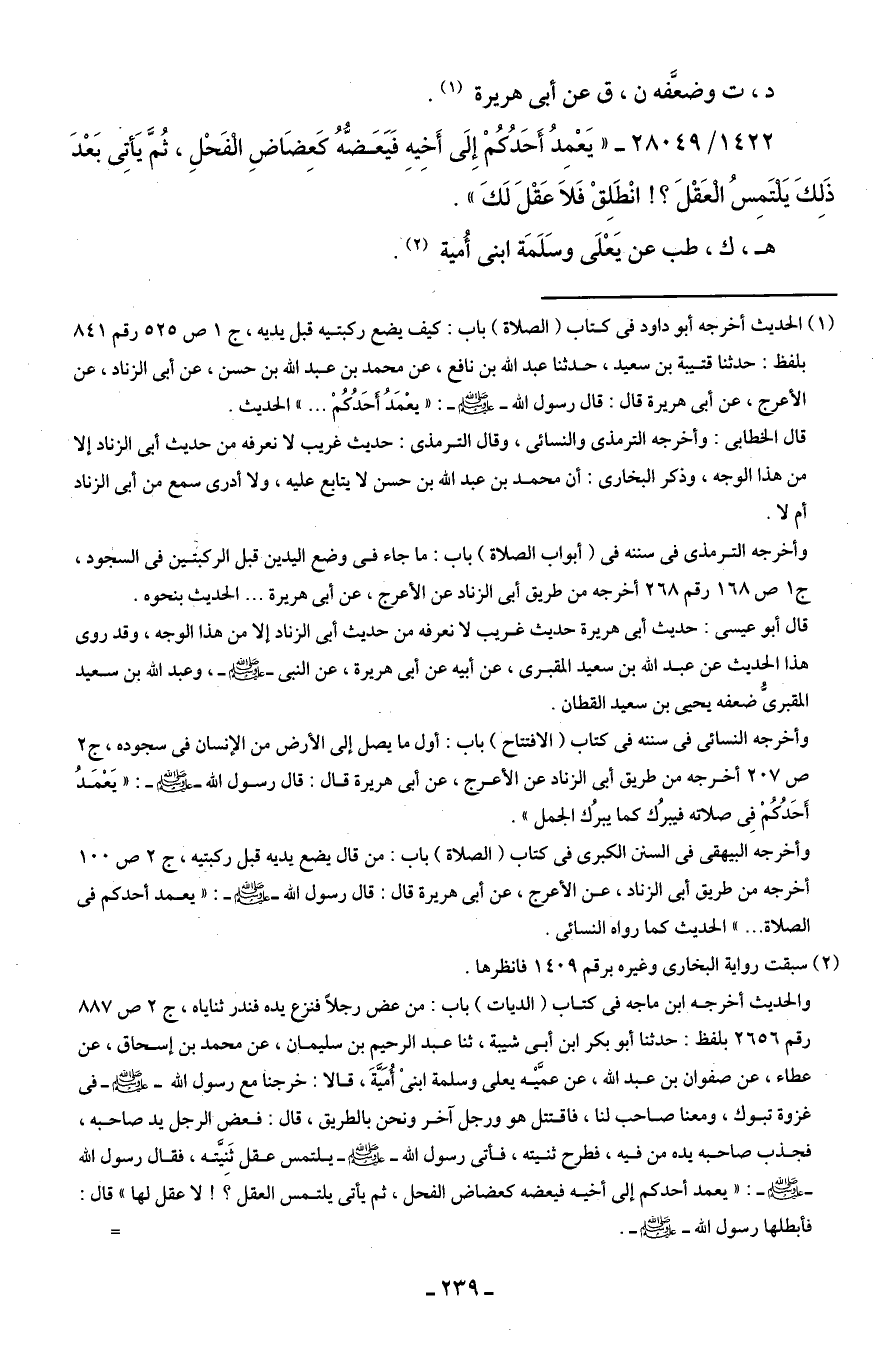 (¬1) الحديث أخرجه أبو داود في كتاب (الصلاة) باب: كيف يضع ركبتيه قبل يديه، جـ 1 ص 525 رقم 841 بلفظ: حدثنا قتيبة بن سعيد، حدثنا عبد اللَّه بن نافع، عن محمد بن عبد اللَّه بن حسن، عن أَبى الزناد، عن الأعرج، عن أَبى هريرة قال: -صلى اللَّه عليه وسلم-: "يعْمَدُ أَحَدُكُمْ. . . " الحديث.