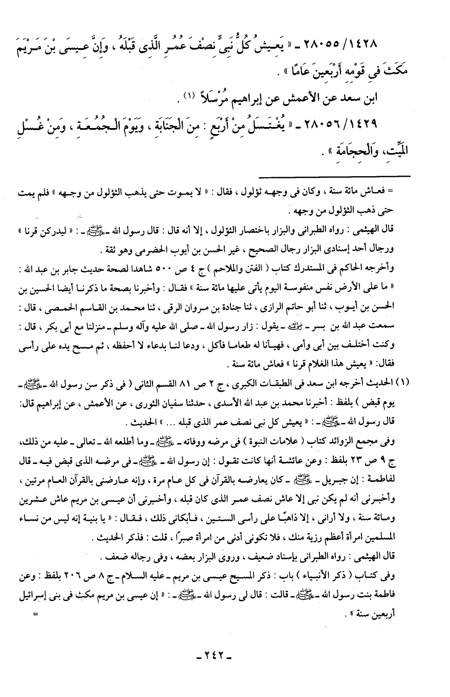 1428/ 28055 - "يَعِيشُ كُلُّ نَبِىٍّ نِصْفَ عُمُرِ الَّذِى قَبْلَهُ، وَإِنَّ عِيسَى بْنَ مَرْيَمَ مَكَثَ فِى قَوْمِهِ أَرْبَعِينَ عَامًا".