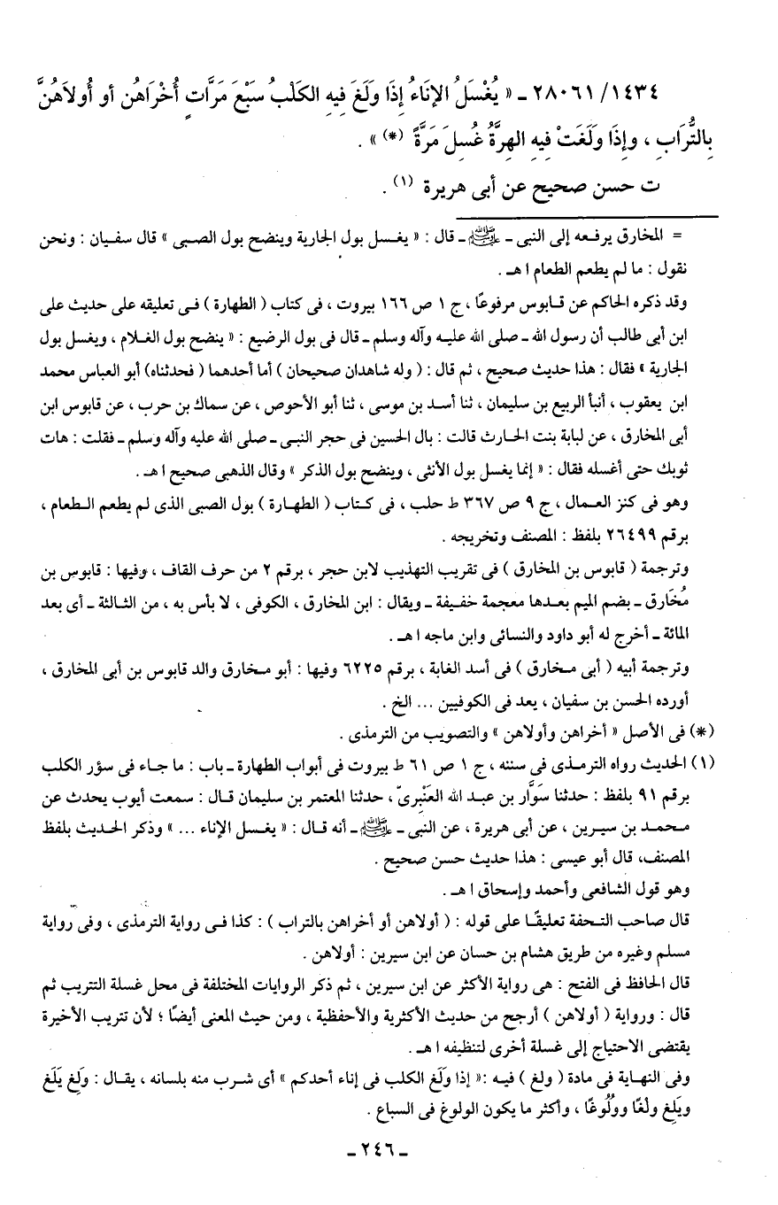 1434/ 28061 - "يُغْسَلُ الإِنَاءُ إِذَا وَلَغَ فِيهِ الكَلْبُ سَبْعَ مَرَّاتٍ أُخْرَاهُن أو أُولَاهُنَّ بِالتُّرَابِ، وإِذَا وَلَغَتْ فِيهِ الهِرَّةُ غُسِلَ مَرَّةً (*) ".