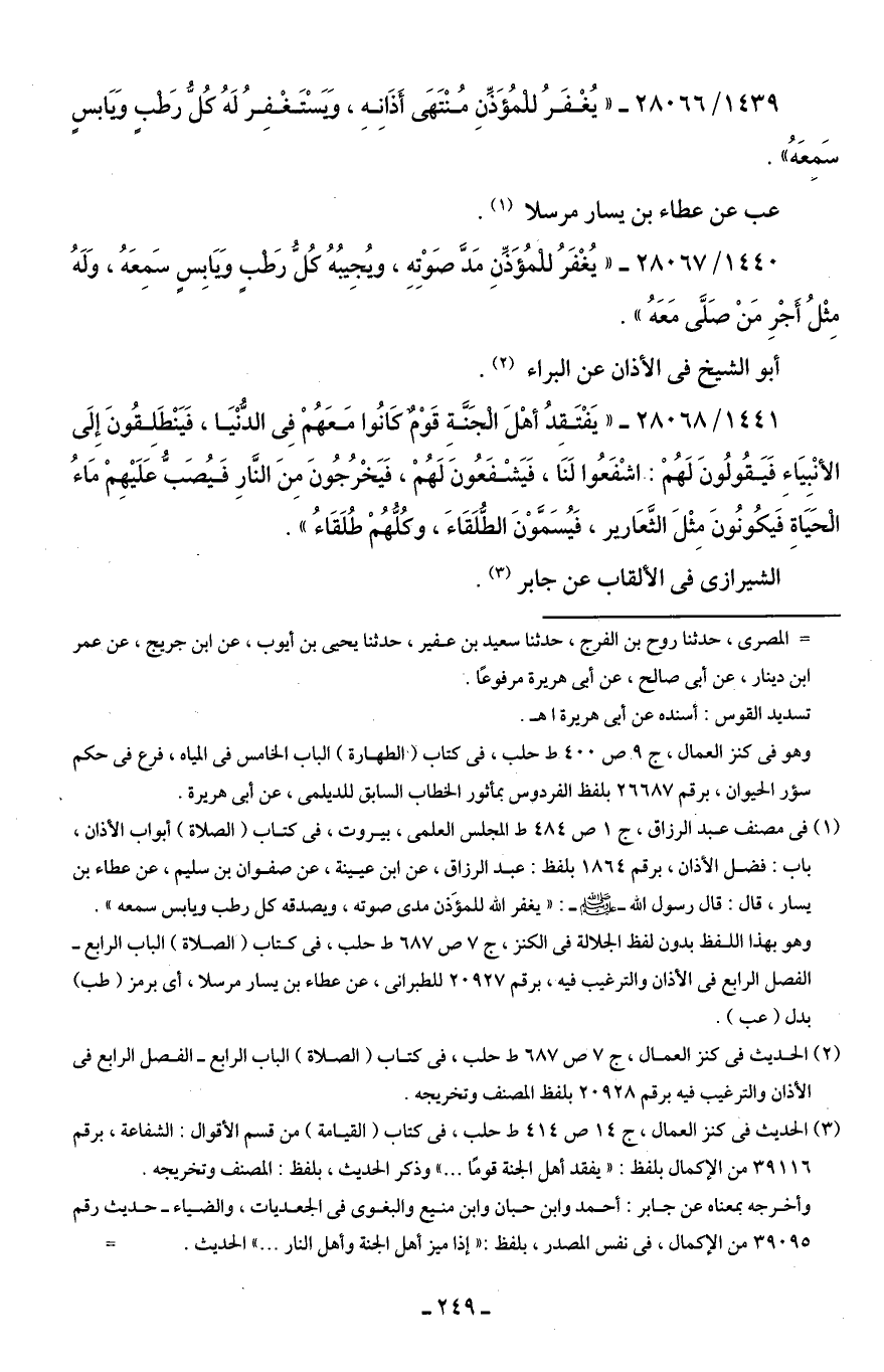 1440/ 28067 - "يُغفَرُ للمُؤَذِّنِ مَدَّ صَوْتِهِ، ويُجِيبُهُ كُلُّ رَطْبٍ وَيَابِسٍ سَمِعَهُ، وَلَهُ مِثْلُ أَجْرِ مَنْ صَلَّى مَعَهُ".