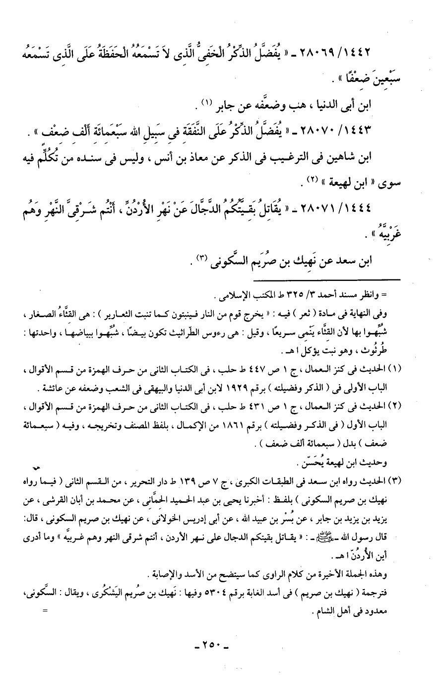 (¬3) الحديث رواه ابن سعد في الطبقات الكبرى، جـ 7 ص 139 ط دار التحرير، من القسم الثانى (فيما رواه نهيك بن صريم السكونى) بلفظ: أخبرنا يحيى بن عبد الحميد الحمَّانِى، عن محمد بن أبان القرشى، عن يزيد بن يزيد بن جابر، عن بُسْر بن عبيد اللَّه، عن أَبى إدريس الخولانى، عن نهيك بن صريم السكونى، قال: قال رسول اللَّه -صلى اللَّه عليه وسلم-: "يقاتل بقيتكم الدجال على نهر الأردن، أنتم شرقى النهر وهم غربيَّه" وما أدرى أين الأُردُن اهـ.