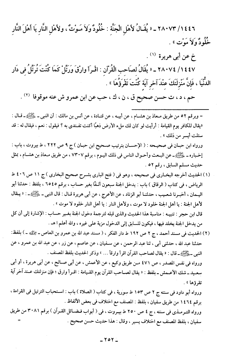 1446/ 28073 - "يُقَالُ لأَهْلِ الْجَنَّةِ: خُلُودٌ وَلَا مَوْتٌ، ولأَهْلِ النَّارِ يَا أَهْلَ النَّارِ خُلُودٌ وَلَا مَوْت".