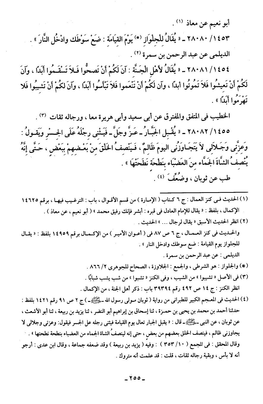 (¬4) الحديث في المعجم الكبير للطبرانى من رواية (ثوبان مولى رسول اللَّه -صلى اللَّه عليه وسلم-) جـ 2 ص 91 رقم 1421 بلفظ: حدثنا أحمد بن محمد بن يحيى بن حمزة، ثنا إسحاق بن إبراهيم أبو النضر، ثنا بزيد بن ربيعة، ثنا أبو الأشعث، عن ثوبان، عن النبى -صلى اللَّه عليه وسلم- قال: "يقبل الجبار تعال يوم القيامة فيثنى رجله عل الجسر فيقول: وعزتى وجلالى لا يجاوزنى ظالم، فينصف الخلق بعضهم من بعضٍ، حتى إنه لينصفُ الشاة الجماء من العضباء بنطحة نطحتها".