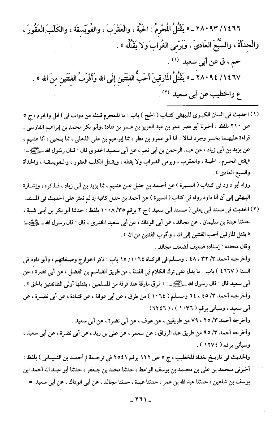 1466/ 28093 - "يَقْتُلُ المُحْرِمُ: الحَيَّة، والْعَقْرَبَ، والفُوَيْسِقَة، والكَلْب الْعَقُورَ، والْحِدَأَةَ، والسَّبُعَ العَادى، وَيَرْمِى الغُرابَ ولا يَقْتُلُه".