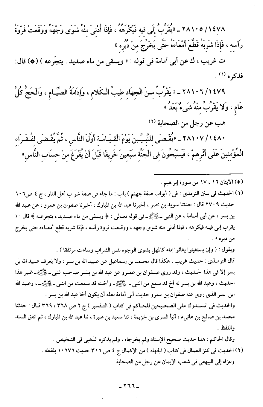 (¬1) الحديث في سنن الترمذى: في (أبواب صفة جهنم) باب: ما جاء في صفة شراب أهل النار، جـ 4 ص 106 حديث 2709 قال: حدثنا سويد بن نصر، أخبرنا عبد اللَّه بن المبارك، أخبرنا صفوان بن عمرو، عن عبيد اللَّه بن بسر، عن أَبى أُمامة، عن النبى -صلى اللَّه عليه وسلم- في قوله تعالى: {وَيُسْقَى مِنْ مَاءٍ صَدِيدٍ (16) يَتَجَرَّعُهُ} قال: "يقرب إلى فيه فيكرهه، فإذا أدنى منه شوى وجهه، ووقعت فروة رأسه، فإذا شربه قطع أمعاءه حتى يخرج من دبره".