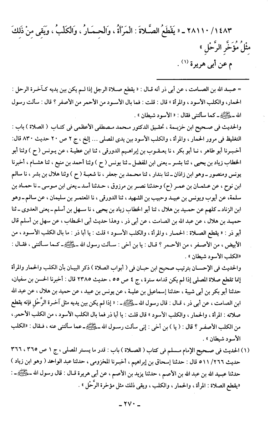 1483/ 28110 - "يَقْطَعُ الصَّلاةَ: الْمَرْأَةُ، وَالْحِمَارُ، والْكَلْبُ، وَيَقِى مِنْ ذَلِكَ مِثْلُ مُؤَخَّرِ الرَّحْلِ".