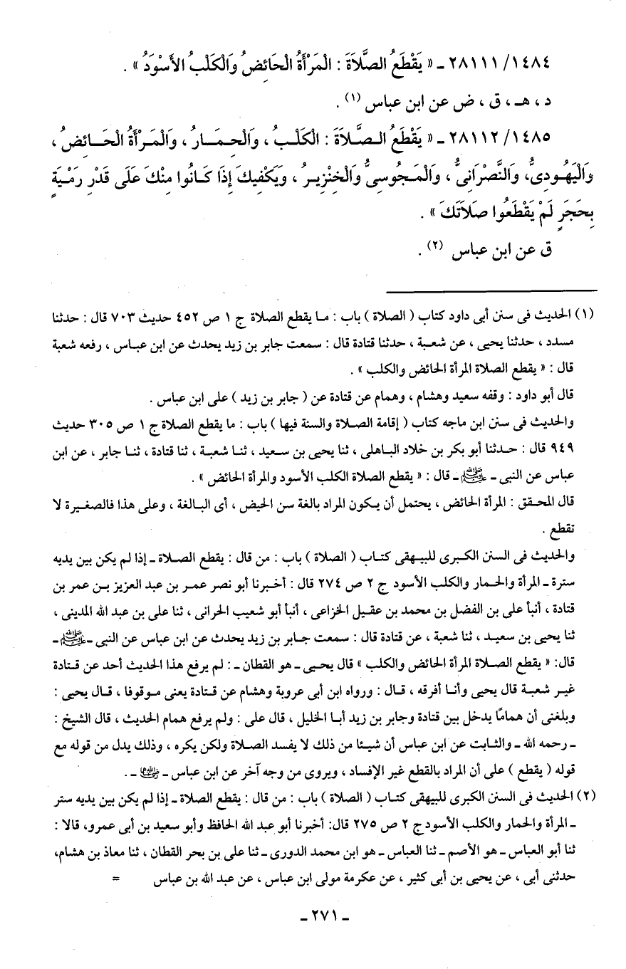 (¬1) الحديث في سنن أَبى داود كتاب (الصلاة) باب: ما يقطع الصلاة جـ 1 ص 452 حديث 703 قال: حدثنا مسدد، حدثنا يحيى، عن شعبة، حدثنا قتادة قال: سمعت جابر بن زيد يحدث عن ابن عباس، رفعه شعبة قال: "يقطع الصلاة المرأة الحائض والكلب".