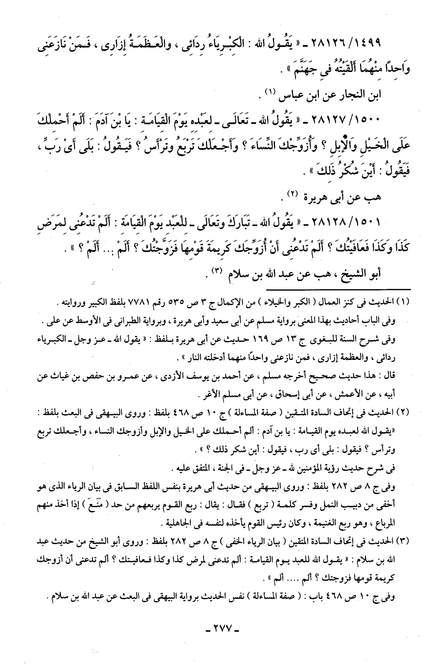 1499/ 28126 - "يَقُولُ اللَّه: الْكِبْرِيَاءُ رِدَائِى، والْعَظَمَةُ إِزَارِى، فَمَنْ نَازَعَنِى وَاحِدًا مِنْهُمَا أَلْقَيْتُهُ فِى جَهَنَّمَ".