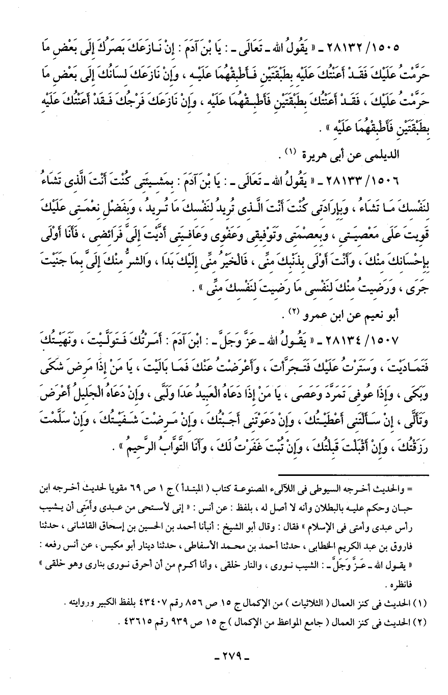 1506/ 28133 - "يَقُولُ اللَّه -تَعَالَى-: يَا بْنَ آدَمَ: بِمَشِيئَتِى كُنْتَ أَنْتَ الَّذِى تَشَاءُ لنَفْسِكَ مَا تَشَاءُ، وَبِإِرَادَتِى كُنْتَ أَنْتَ الَّذِى تُرِيدُ لنَفْسِكَ مَا تُرِيدُ، وَبِفَضْل نِعْمَتِى عَلَيْكَ قَوِيتَ عَلَى مَعْصِيَتِى، وَبِعِصْمِتَى وتَوْفِيْقِى وَعَفْوِى وَعَافِيَتِى أَدَّيْتَ إِلَىَّ فَرَائِضِى، فَأَنَا أَوْلَى بِإِحْسَانِكَ مِنْكَ، وَأَنْتَ أَوْلَى بِذَنْبِكَ مِنِّى، فَالْخَيْرُ مِنِّى إِلَيْكَ بَدَا، والشرُّ مِنْكَ إِلَىَّ بِمَا جَنَيْتَ جَرَى، وَرَضِيتُ مِنْكَ لِنَفْسِى مَا رَضِيتَ لِنَفْسِكَ مِنِّى".