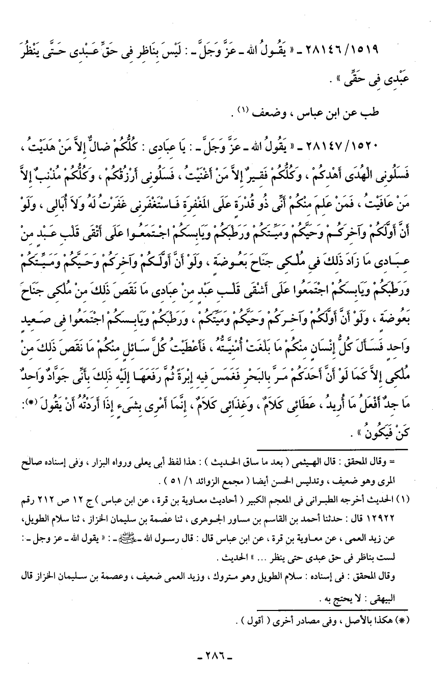1520/ 28147 - "يَقُولُ اللَّه -عَزَّ وَجَلَّ-: يَا عِبَادِى: كُلُّكُمْ ضالٌّ إِلَّا مَنْ هَدَيْتُ، فَسَلُونِى الْهُدَى أَهْدِكُمُ، وَكُلُّكُمْ فَقِيرٌ إِلَّا مَنْ أَغْنَيْتُ، فَسَلُونِى أَرْزُقكُمْ، وَكُلُّكُمْ مُذْنِبٌ إِلَّا مَنْ عَافَيْتُ، فَمَنْ عَلِمَ مِنْكُمْ أَنِّى ذُو قُدْرَةٍ عَلَى المَغْفِرَةِ فَاسْتَغْفَرِنِى غَفَرْتُ لَهُ وَلَا أُبَالِى، وَلَوْ أَنَّ أَوَّلَكُمْ وَآخِرَكُمْ وَحَيَّكُمْ وَمَيِّتَكُمْ وَرَطْبَكُمْ وَيَابِسَكُمْ اجْتَمَعُوا عَلَى أَتْقَى قَلْبِ عَبْدٍ مِنْ عِبَادِى مَا زَادَ ذَلِكَ فِى مُلْكِى جَنَاحَ بَعُوضَةٍ، وَلَوْ أَنَّ أَوَّلَكُمْ وَآخِرَكُمْ وَحَيَّكُمْ وَمَيِّتَكُمْ وَرَطْبَكُمْ وَيَابسَكُمْ اجْتَمَعُوا عَلَى أَشْقَى قَلْبِ عَبْدٍ مِنْ عِبَادِى مَا نَقَصَ ذَلِكَ مِنْ مُلْكِى جَنَاحَ بَعُوضَةٍ، وَلَوْ أَنَّ أَوَّلَكُمْ وَآخِرَكُمْ وَحَيَّكُمْ وَمَيِّتَكُمْ، وَرَطْبَكُمْ وَيَابِسَكُمْ اجْتَمَعُوا فِى صَعِيدٍ وَاحِدٍ فَسَأَلَ كُلُّ إِنْسَانٍ مِنْكُمْ مَا بَلْغَتْ أُمْنِيَّتُّهُ، فَأَعْطَيْتُ كُلَّ سَائِلٍ مِنْكُمْ مَا نَقَصَ ذَلِكَ مِنْ مُلْكِى إِلَّا كَمَا لَوْ أَنَّ أَحَدَكُمْ مَرَّ بِالبَحْرِ فَغَمَسَ فِيهِ إِبْرَةً ثُمَّ رَفَعَهَا إِلَيْهِ ذَلِكَ بِأَنِّى جَوَّادٌ وَاحِدٌ مَاجِدٌ أَفْعَلُ مَا أُرِيدُ، عَطَائِى كَلَامٌ، وَغِذائِى كَلَامٌ، إِنَّمَا أَمْرِى بِشَئٍ إِذَا أَرَدْتُهُ أَنْ يَقُولَ (*): كُنْ فَيَكُونُ".