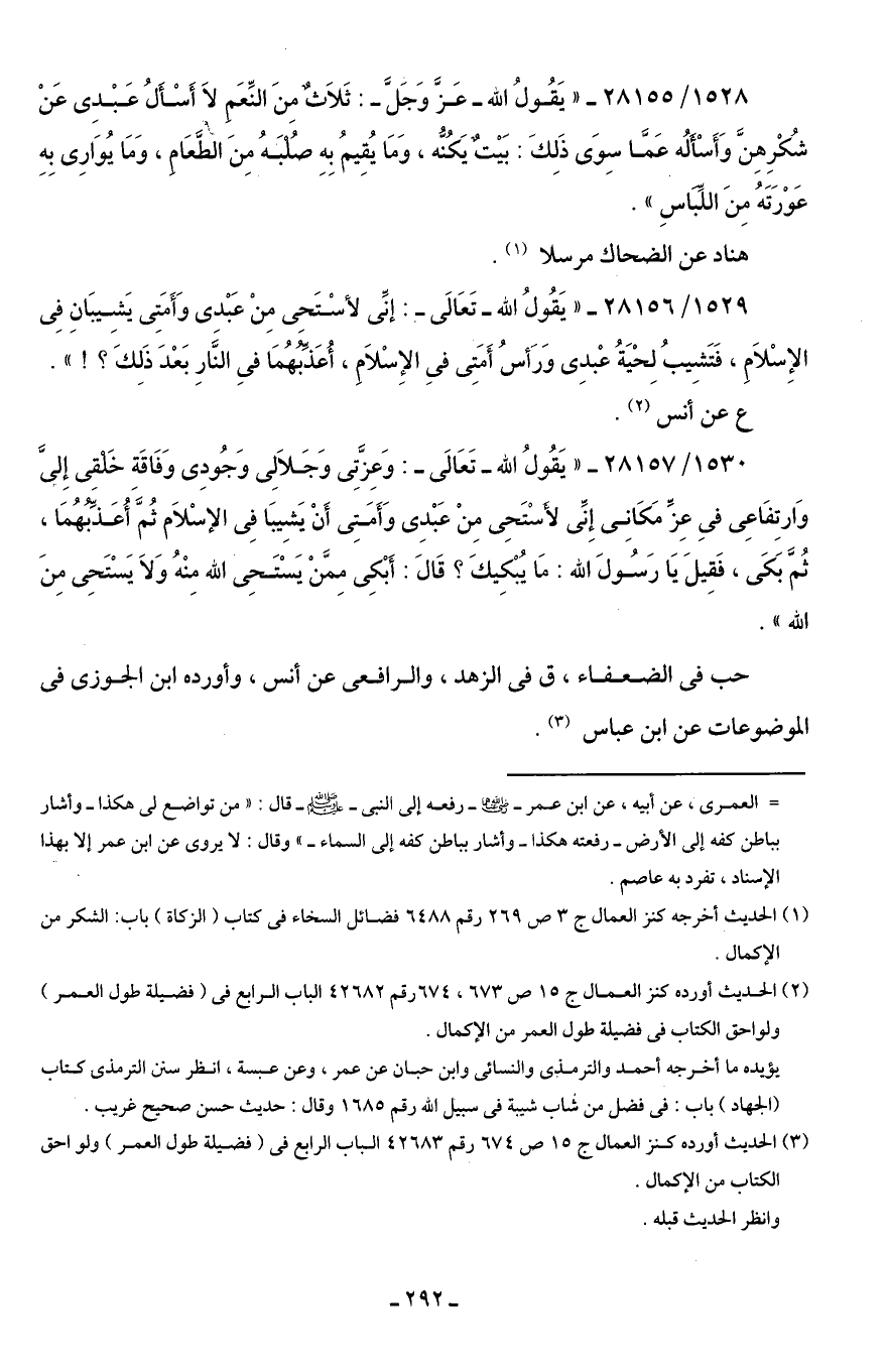 1528/ 28155 - "يَقُولُ اللَّه -عَزَّ وَجَلَّ-: ثَلَاثٌ مِنَ النِّعَمِ لَا أَسْأَلُ عَبْدِى عَنْ شُكْرِهِنَّ وَأَسْالُه عَمَّا سِوَى ذَلِكَ: بَيْتٌ يَكُنُّه، وَمَا يُقِيمُ بِهِ صُلبَهُ مِنَ الطَّعَامِ، وَمَا يُوَارِى بِهِ عَوْرَتَهُ مِنَ اللِّبَاسِ".