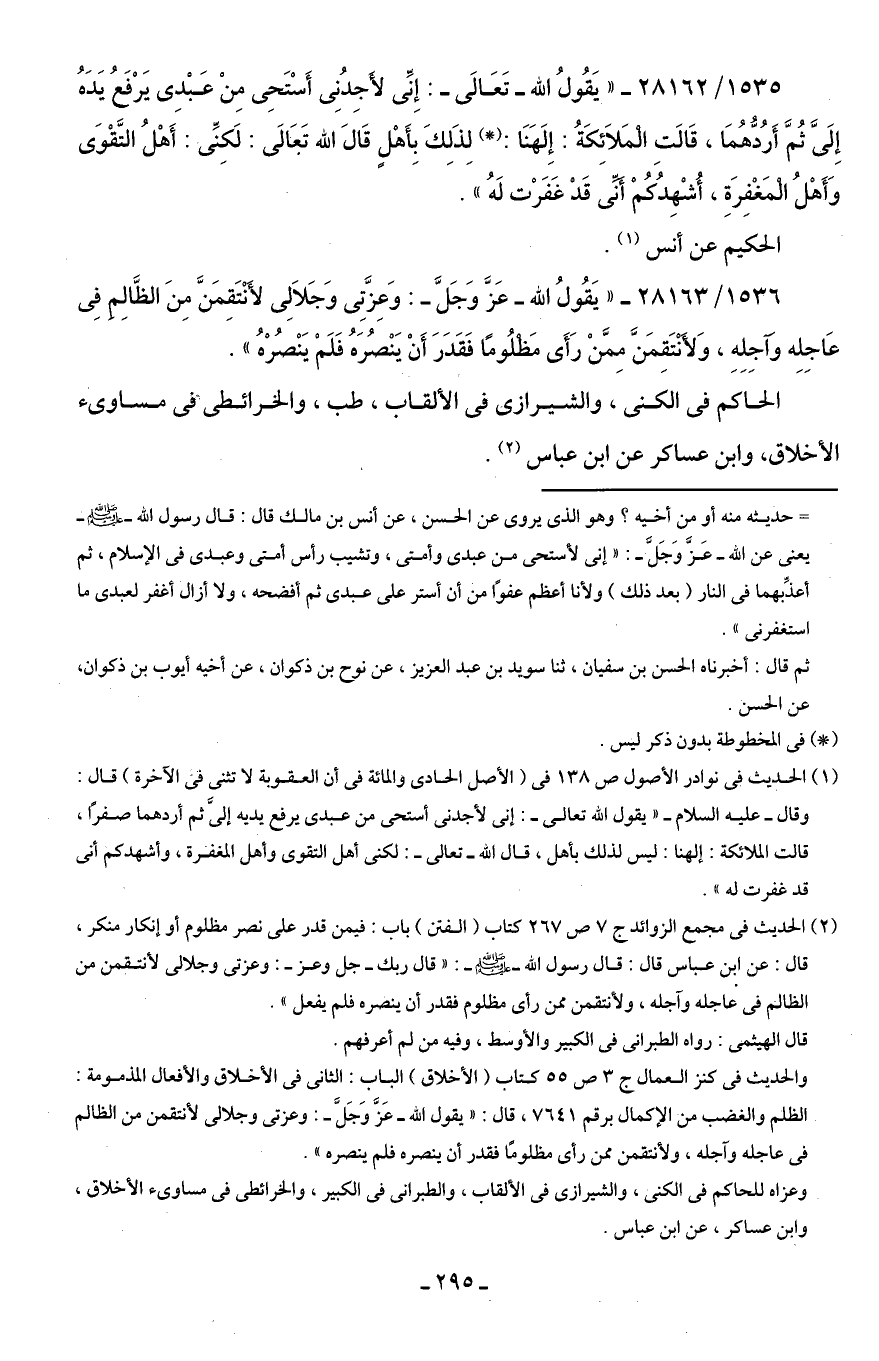 1535/ 28162 - "يَقُولُ اللَّه -تَعَالَى-: إِنِّى لأَجِدُنِى أَسْتَحِى مِنْ عَبْدِى يَرْفَعُ يَدَهُ إِلَىَّ ثُمَّ أَرُدُّهُمَا، قَالَتِ الْمَلَائِكَةُ: إِلَهَنَا: (*) لِذَلِكَ بِأَهْلٍ قَالَ اللَّه تَعَالَى: لَكِنِّى: أَهْلُ التَّقْوَى وَأَهْلُ الْمَغْفِرَةِ، أُشْهِدُكُمْ أَنِّى قَدْ غَفَرْت لَهُ".