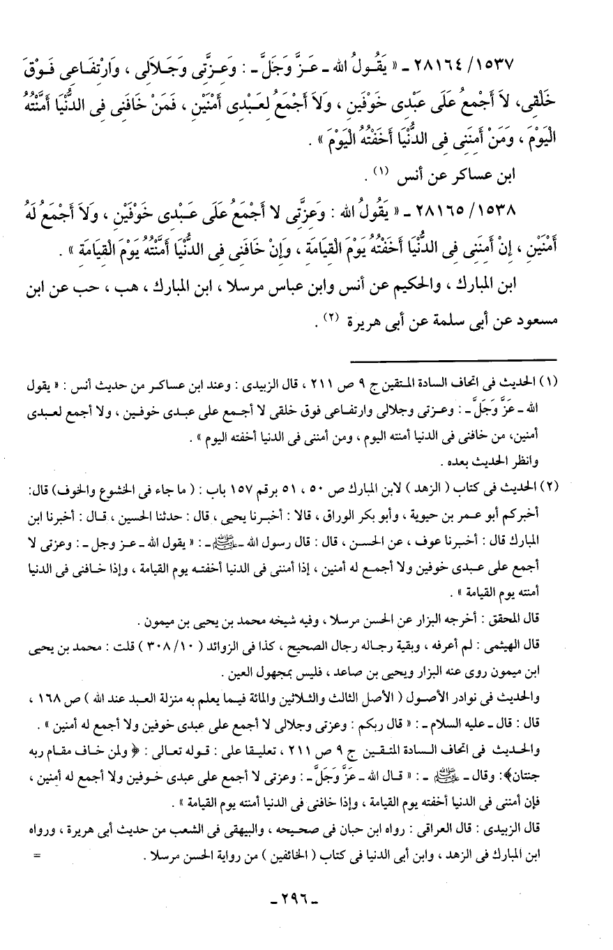 1538/ 28165 - "يَقُولُ اللَّه: وَعِزَّتِى لا أَجْمَعُ عَلَى عَبْدِى خَوْفَيْنِ، وَلَا أَجْمَعُ لَهُ أَمْنَيْنِ، إِنْ أَمِنَنِى في الدُّنْيَا أَخَفْتُهُ يَوْمَ الْقِيَامَةِ، وَإِنْ خَافَنِى في الدُّنْيَا أَمَّنْتُهُ يَوْمَ الْقِيَامَةِ".
