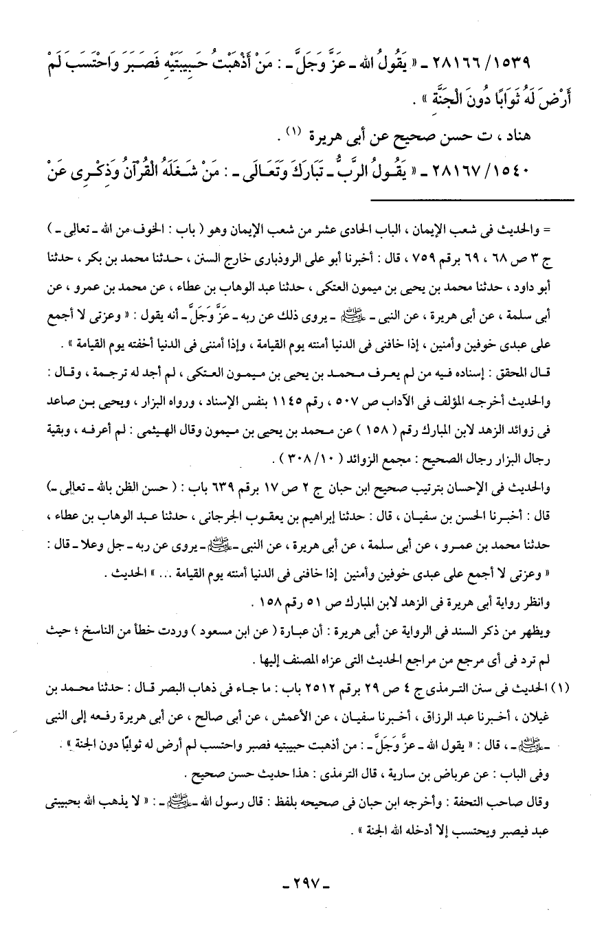 (¬1) الحديث في سنن الترمذى جـ 4 ص 29 برقم 2512 باب: ما جاء في ذهاب البصر قال: حدثنا محمد بن غيلان، أخبرنا عبد الرزاق، أخبرنا سفيان، عن الأعمش، عن أَبى صالح، عن أَبى هريرة رفعه إلى النبى -صلى اللَّه عليه وسلم-، قال: "يقول اللَّه -عزَّ وَجَلَّ-: من أذهبت حبيبتيه فصبر واحتسب لم أرض له ثوابًا دون الجنة".