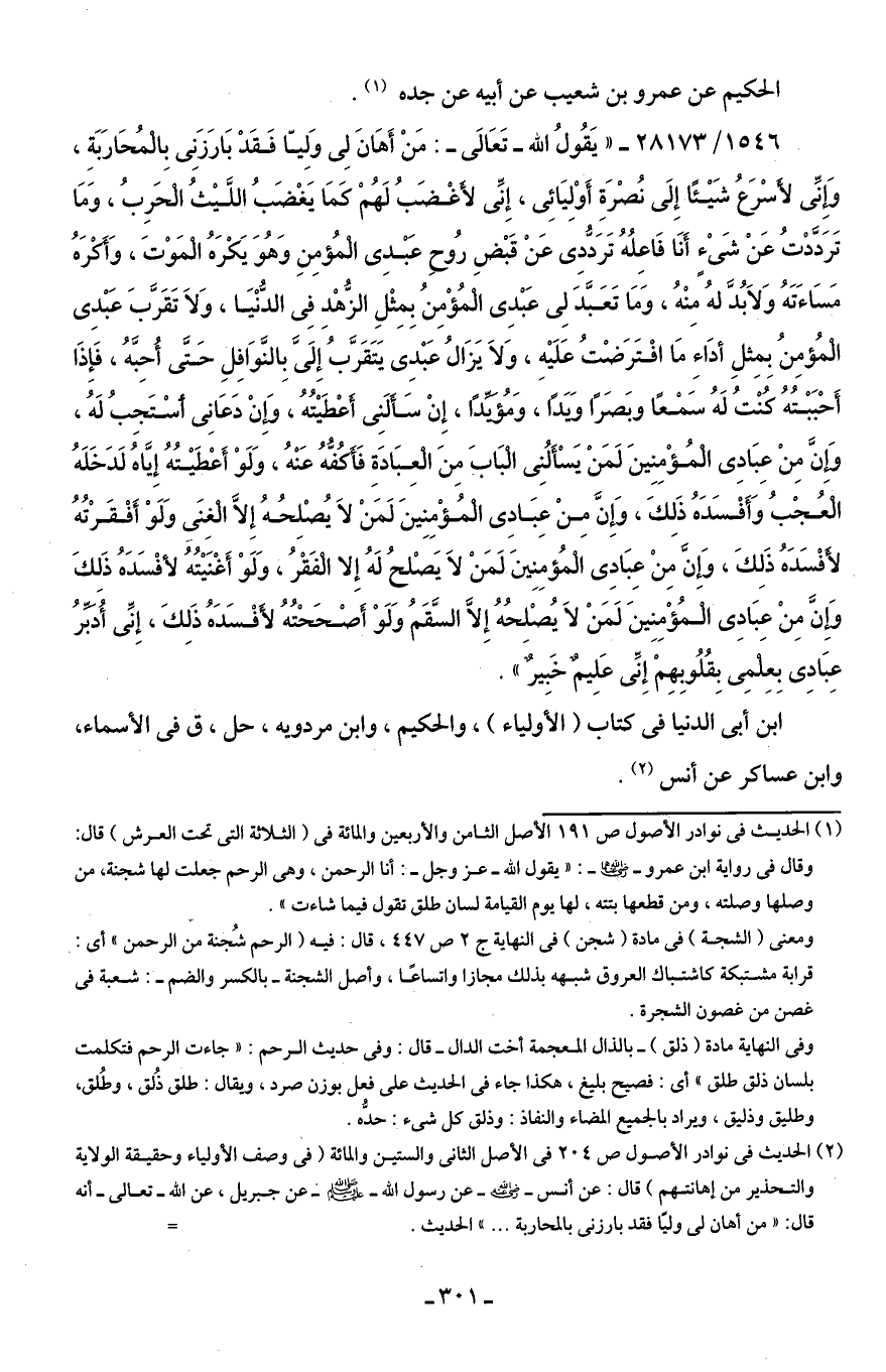 (¬2) الحديث في نوادر الأصول ص 204 في الأصل الثانى والستين والمائة (في وصف الأولياء وحقيقة الولاية والتحذير من إهانتهم) قال: عن أنس -رضي اللَّه عنه- عن رسول اللَّه -صلى اللَّه عليه وسلم- عن جبريل، عن اللَّه -تعالى- أنه قال: "من أهان لى وليًّا فقد بارزنى بالمحاربة. . . " الحديث. =