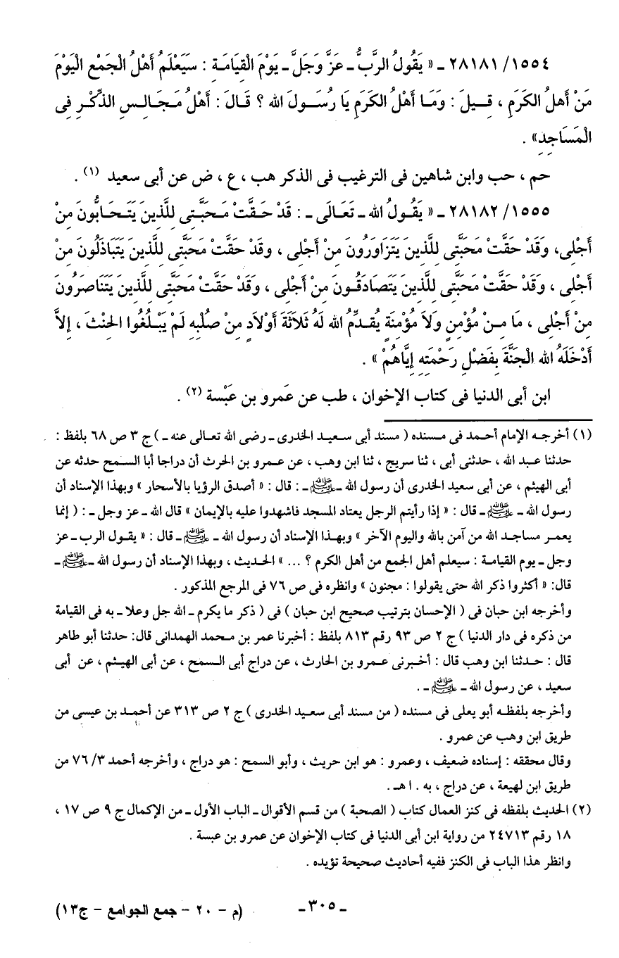 (¬2) الحديث بلفظه في كنز العمال كتاب (الصحبة) من قسم الأقوال - الباب الأول - من الإكمال جـ 9 ص 17، 18 رقم 24713 من رواية ابن أَبى الدنيا في كتاب الإخوان عن عمرو بن عبسة.