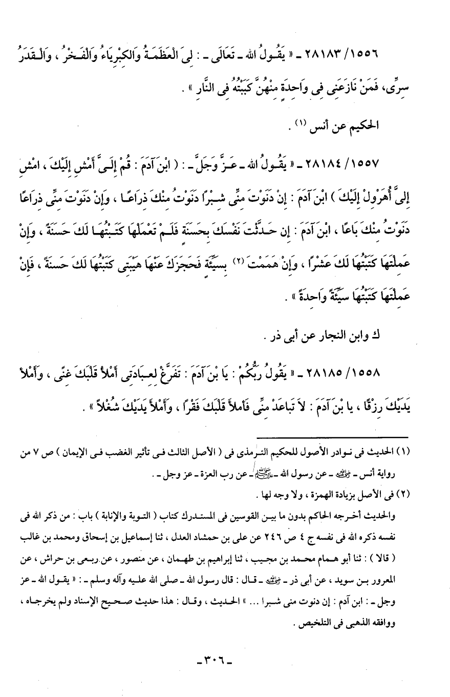 1557/ 28184 - "يَقُولُ اللَّه -عَزَّ وَجَلَّ-: (ابْنَ آدَمَ: قُمْ إِلَىَّ أَمْشِ إِلَيْكَ، امْشِ إِلىَّ أُهَرْوِلْ إِلَيْكَ) ابْنَ آدَمَ: إِنْ دَنَوْتَ مِنِّى شِبْرًا دَنَوْتُ مِنْكَ ذِرَاعًا، وَإِنْ دَنَوْتَ مِنِّى ذِرَاعًا دَنَوْتُ مِنْكَ بَاعًا، ابْنَ آدَمَ: إِنَّ حَدَّثْتَ نَفْسَكَ بِحَسَنَةٍ فَلَمْ تَعْمَلهَا كتَبْتُهَا لَكَ حَسَنَةً، وَإِنْ عَمِلتَهَا كَتَبْتُهَا لَكَ عَشْرًا، وَإِنْ هَمَمْتَ (¬2) بِسَيِّئَةٍ فَحَجَزَكَ عَنْهَا هَيْبَتِى كَتَبْتُهَا لَكَ حَسنَةً، فَإِنْ عَمِلتَهَا كَتَبْتُهَا سَيِّئَةً وَاحِدَةً".