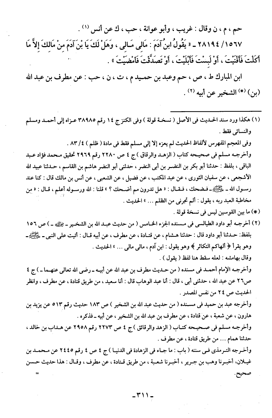 وأخرجه مسلم في صحيحه كتاب (الزهد والرقائق) جـ 4 ص 2273 رقم 2958 عن هداب بن خالد، حدثنا همام. . . من طريق قتادة، عن مطرف.