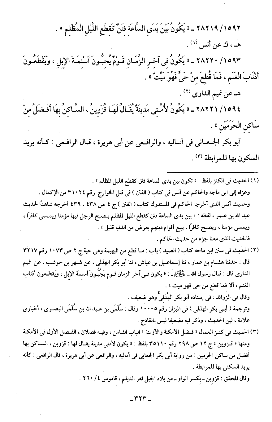 (¬3) الحديث في كنز العمال "فضل الأمكنة والأزمنة" الباب الثامن، وفيه فصلان، الفصل الأول في الأمكنة ومنها "قزوين" جـ 12 ص 298 رقم 35110 بلفظ: "يكون لأمتى مدينة يقال لها: قزوين، الساكن بها أفضل من ساكن الحرمين" من رواية أَبى بكر الجعابى في أماليه، والرافعى عن أَبى هريرة، قال الرافعى: كأنه يريد السكنى بها للمرابطة.