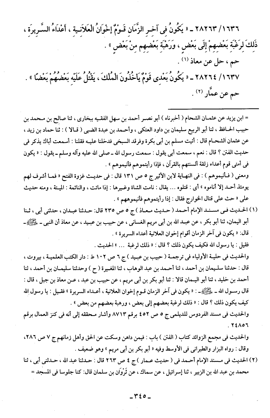 1636/ 28263 - "يَكُونُ فِى آخِرِ الزَّمَانِ قَوْمٌ إخْوَانُ الْعَلَانِيةِ، أَعْدَاءُ السَّرِيرَةِ، ذَلِكَ لِرَغْبَةِ بَعْضِهِمْ إِلَى بَعْضٍ، وَرَهْبَةِ بَعْضِهِم مِنْ بَعْضٍ".
