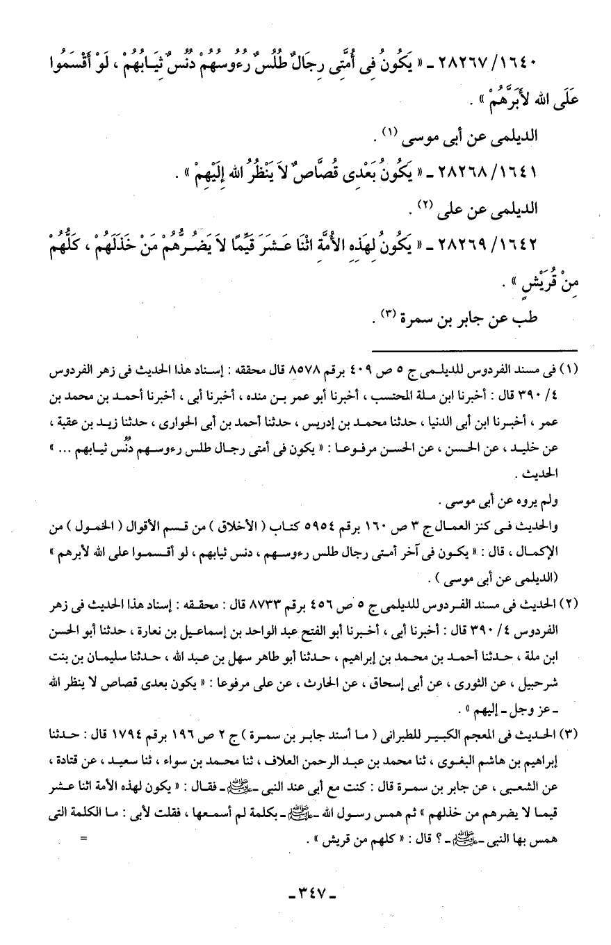 1642/ 28269 - "يَكُونُ لِهَذِهِ الأُمَّةِ اثْنَا عَشَرَ قَيِّمًا لَا يَضُرُّهُمْ مَنْ خَذَلَهُمْ، كَلُّهُمْ مِنْ قُرَيْشٍ".