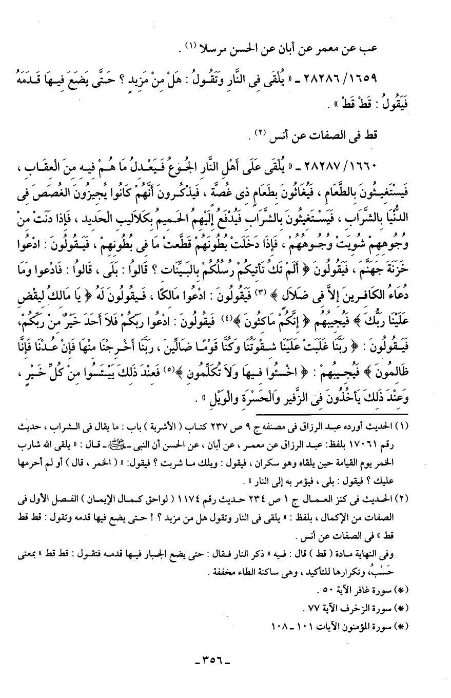(¬2) الحديث في كنز العمال جـ 1 ص 234 حديث رقم 1174 (لواحق كمال الإيمان) الفصل الأول في الصفات من الإكمال، بلفظ: "يلقى في النار وتقول هل من مزيد؟ ! حتى يضع فيها قدمه وتقول: قط قط قط" في الصفات عن أَنس.