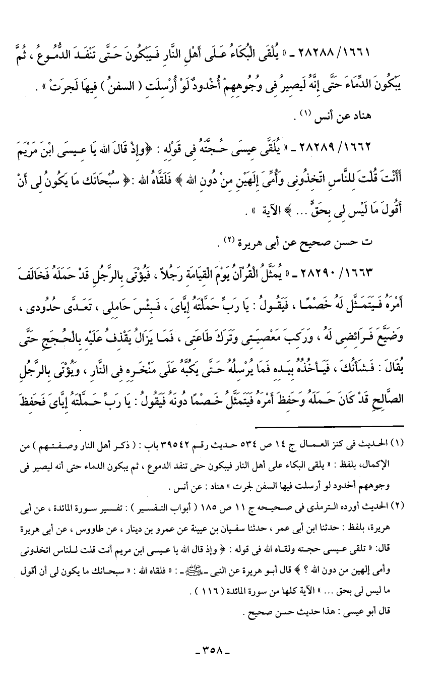 (¬2) الحديث أورده الترمذى في صحيحه جـ 11 ص 185 (أبواب التفسير). تفسير سورة المائدة، عن أَبى هريرة، بلفظ: حدثنا ابن أَبى عمر، حدثنا سفيان بن عيينة عن عمرو بن دينار، عن طاووس، عن أَبى هريرة قال: "تلقى عيسى حجته ولقاه اللَّه في قوله: {وَإِذْ قَالَ اللَّهُ يَاعِيسَى ابْنَ مَرْيَمَ أَأَنْتَ قُلْتَ لِلنَّاسِ اتَّخِذُونِي وَأُمِّيَ إِلَهَيْنِ مِنْ دُونِ اللَّهِ} قال أبو هريرة عن النبى -صلى اللَّه عليه وسلم-: "فلقاه اللَّه: {سُبْحَانَكَ مَا يَكُونُ لِى أَنْ أَقُولَ مَا لَيْسَ لِى بِحَقٍّ. . .} الآية كلها من سورة المائدة (116).