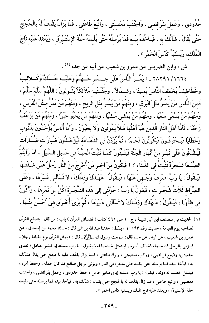 1664/ 28291 - "يَمُرُّ النَّاسُ عَلَى جِسْرِ جَهَنَّمَ وَعَلَيْهِ حَسَكٌ وَكَلاليبُ وخَطَاطيفُ يَخْطِفُ النَّاسَ يَمينًا، وشِمَالًا، وجَنْبَتَيهِ مَلَائِكَةٌ يَقُولونَ: اللَّهُمَّ سَلِّمْ سَلِّمْ، فَمِنَ النَّاسِ مَنْ يَمُرُّ مِثْلَ الْبَرَقِ، ومِنْهُمْ مَنْ يَمُرُّ مِثْلَ الريحِ، وَمِنْهُمْ مَنْ يَمُرُّ مِثْلَ الْفَرَسِ، وَمِنْهُمْ مَنْ يَسْعَى سَعْيًا، ومِنْهُمْ مَنْ يَمْشِى مَشْيًا، وَمِنْهُمْ مَن يَحْبُو حَبْوًا، وَمِنْهُمْ مَنْ يَزْحَفُ زَحْفًا، فَأَمَّا أَهْلُ النَّار الَّذِين هُمْ أَهْلُهَا فَلَا يَمُوتُون وَلَا يَحْيَوْنَ، وَأمَّا أُنَاسٌ يُؤْخَذُونَ بِذُنُوبٍ وَخَطَايَا فَيَحْتَرِقُونَ فَيكُونُونَ فَحْمًا، ثُمَّ يُؤْذَنُ فِى الشَّفَاعَة فَيُؤْخَذُونَ ضُبَارَات ضُبَارَاتٍ فَيُقْذَفُونَ عَلَى نَهْرٍ مِنْ أَنْهَار الْجَنَّة فَيَنْبُتُونَ كَمَا تَنْبُتُ الْحبَّةُ فِى حَميلِ السَّيْلِ، أمَا رَأيْتُمْ الصِّبْغَا شَجَرَةً تَنْبُتُ فِى الغُثَاءِ؟ ! فَيكُونُ مِنْ آخِرِ مَنْ أُخْرِجَ مِنَ النَّارِ رَجُلٌ عَلَى شَفَتِهَا فَيَقُولُ: يَا رَبِّ اصْرِفْ وَجْهِى عَنْهَا، فَيَقُولُ: عَهْدَكَ وذِمَّتَكَ، لا تَسْألْنِى غَيْرَهَا، وَعَلَى الصِّرَاطِ ثَلَاثُ شَجَراتٍ، فَيَقولُ يَا رَبِّ: حَوّلْنِى إلى هَذِهِ الشَّجَرَةِ آكُلُ مِنْ ثَمَرِهَا، وَأَكوُنُ فِى ظِلِّهَا، فَيَقُولُ: عَهْدَكَ وذِمَّتَكَ لا تَسْأَلْنِى غَيْرَهَا، ثُمَّ يَرَى أُخْرَى هِى أَحْسَنُ مِنْهَا،
