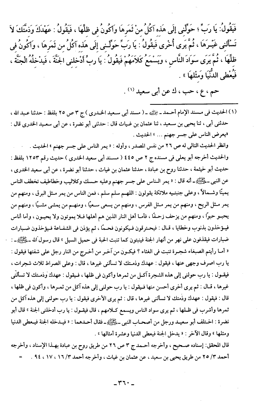 (¬1) الحديث في مسند الإمام أحمد -رضي اللَّه عنه- (مسند أَبى سعيد الخدرى) جـ 3 ص 25 بلفظ: حدثنا عبد اللَّه، حدثنى أَبى، ثنا يحيى بن سعيد، ثنا عثمان بن غياث قال: حدثنى أبو نضرة، عن أَبى سعيد الخدرى قال: "يعرض الناس على جسر جهنم. . . " الحديث.