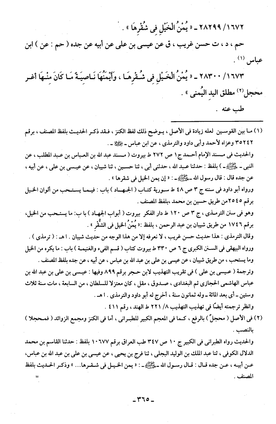 والحديث في مسند الإمام أحمد جـ 1 ص 272 ط بيروت (مسند عبد اللَّه بن العباس بن عبد المطلب، عن النبى -صلى اللَّه عليه وسلم-) بلفظ: حدثنا عبد اللَّه، حدثنى أَبى، ثنا حسين، ثنا شيبان، عن عيسى بن على، عن أبيه، عن جده قال: قال رسول اللَّه -صلى اللَّه عليه وسلم-: "إن يمن الخيل في شقرها".