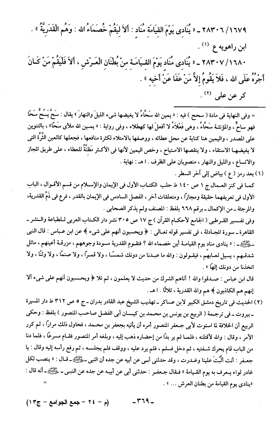 1679/ 28306 - "يُنَادِى يَوْمَ الْقِيَامَةِ مُنَادٍ: أَلَا لِيَقُمْ خُصَمَاءُ اللَّه: وَهُم الْقَدَرِيةُ".
