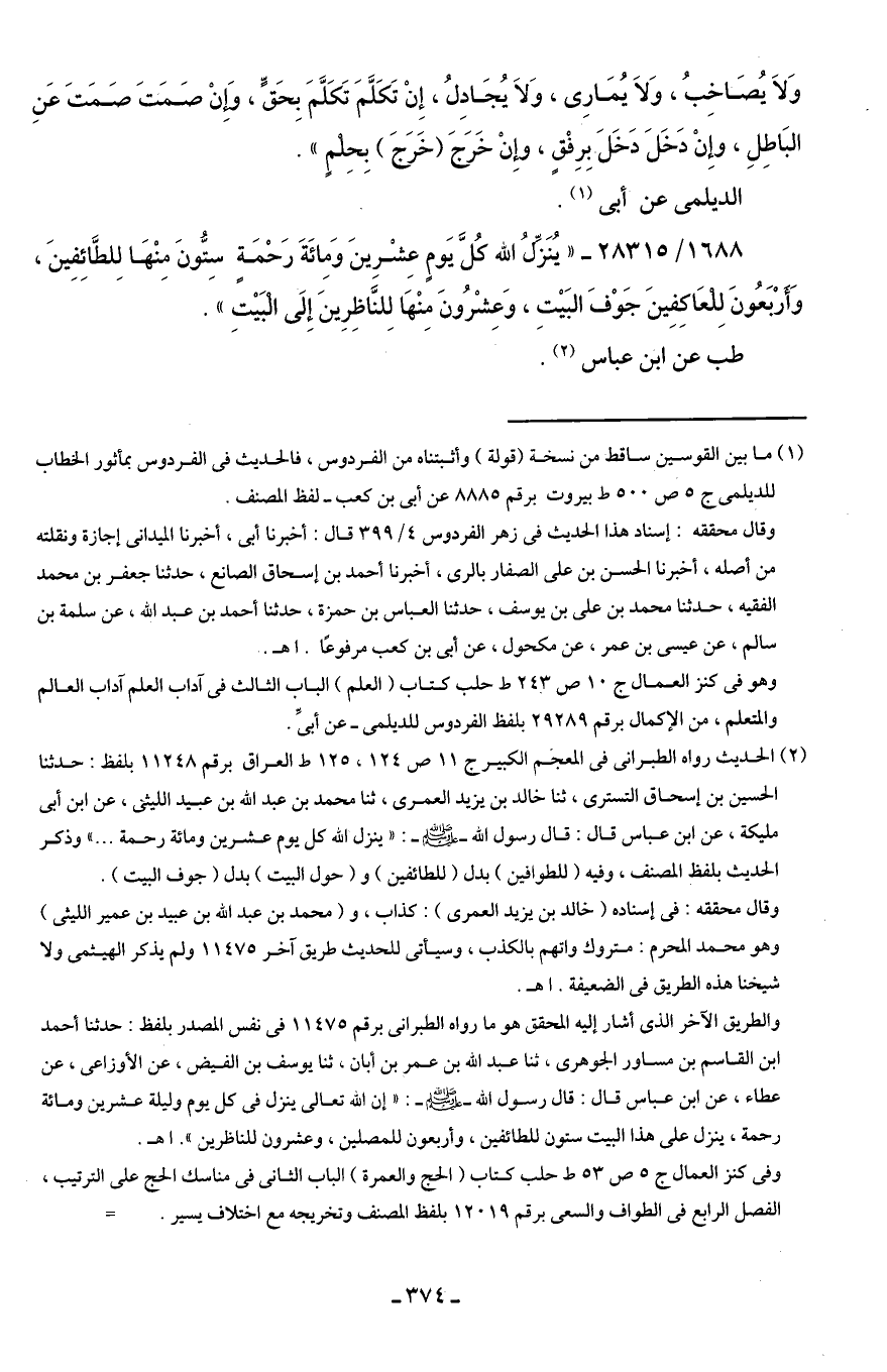 1688/ 28315 - "يُنَزِّلُ اللَّه كُلَّ يَومٍ عِشْرِينَ وَمِائَةَ رَحْمَةٍ سِتُّونَ مِنْهَا لِلطَّائِفِينَ، وَأَرْبَعُونَ لِلعَاكفِينَ جَوْفَ البَيْتِ، وَعِشْرُونَ مِنْهَا لِلنَّاظِرِينَ إِلَى الْبَيْت".