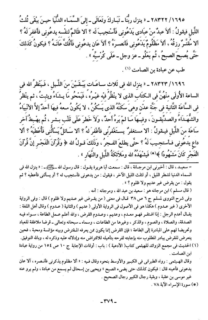 1696/ 28323 - "ينزِل اللَّه فِى ثَلاثِ ساعَاتٍ يَبْقَيْنَ مِنَ اللَّيلِ، فَيَنْظرُ اللَّه فِى الساعة الأُولَى مِنْهُنَّ فِى الكِتَابِ الذِى لا ينْظُرُ فِيْه غيْرُه، فَيَمْحُو مَا يشَاءُ ويثبِتُ، ثم ينْظرُ في السَّاعَةِ الثَّانِيةِ في جَنَّةِ عدْنٍ وهِى سَكَنُهُ الذِى يَسَكنُ، لا يَكُونُ معهُ فِيهَا أَحدٌ إلَّا الأنْبيَاءُ والشُّهَدَاءُ والصدِّيقونَ، وفِيهَا مَا لمْ يَرهُ أَحدٌ، وَلَا خَطرَ عَلَى قَلب بشرٍ، ثُم يهْبِطُ آخِر سَاعَةٍ مِنَ اللَّيلِ فيقولُ: ألا مستغفرٌ يستَغْفرُنِى فأَغفِرَ لهُ؟ ألا سَائلٌ يَسْألُنِى فَأُعْطيَهُ؟ أَلا داعٍ يَدعُونِى فأستجيبَ لَهُ؟ حَتَّى يطلعَ الفجرُ، وَذَلكَ قولُ اللَّه {وَقُرْآنَ الْفَجْرِ إِنَّ قُرْآنَ الْفَجْرِ كَانَ مَشْهُودًا} (*) فَيشْهَدُهُ اللَّه ومَلَائِكَةُ اللَّيلِ والنَّهَارِ".