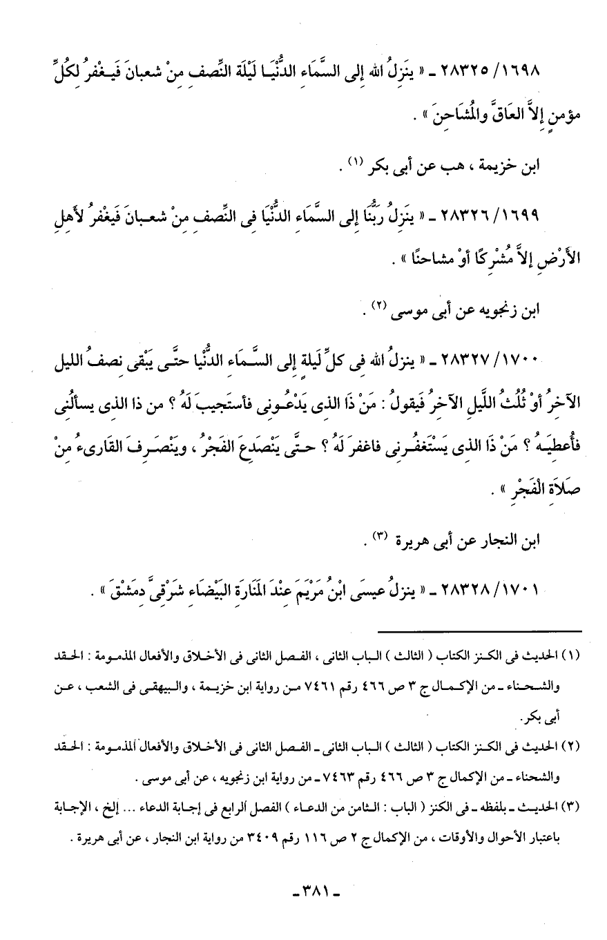 1698/ 28325 - "ينَزِلُ اللَّه إِلى السَّمَاءِ الدُّنْيَا لَيْلَة النِّصفِ مِنْ شعبانَ فَيغْفرُ لِكُلِّ مؤمنٍ إِلَّا العَاقَّ والمُشَاحِنَ".
