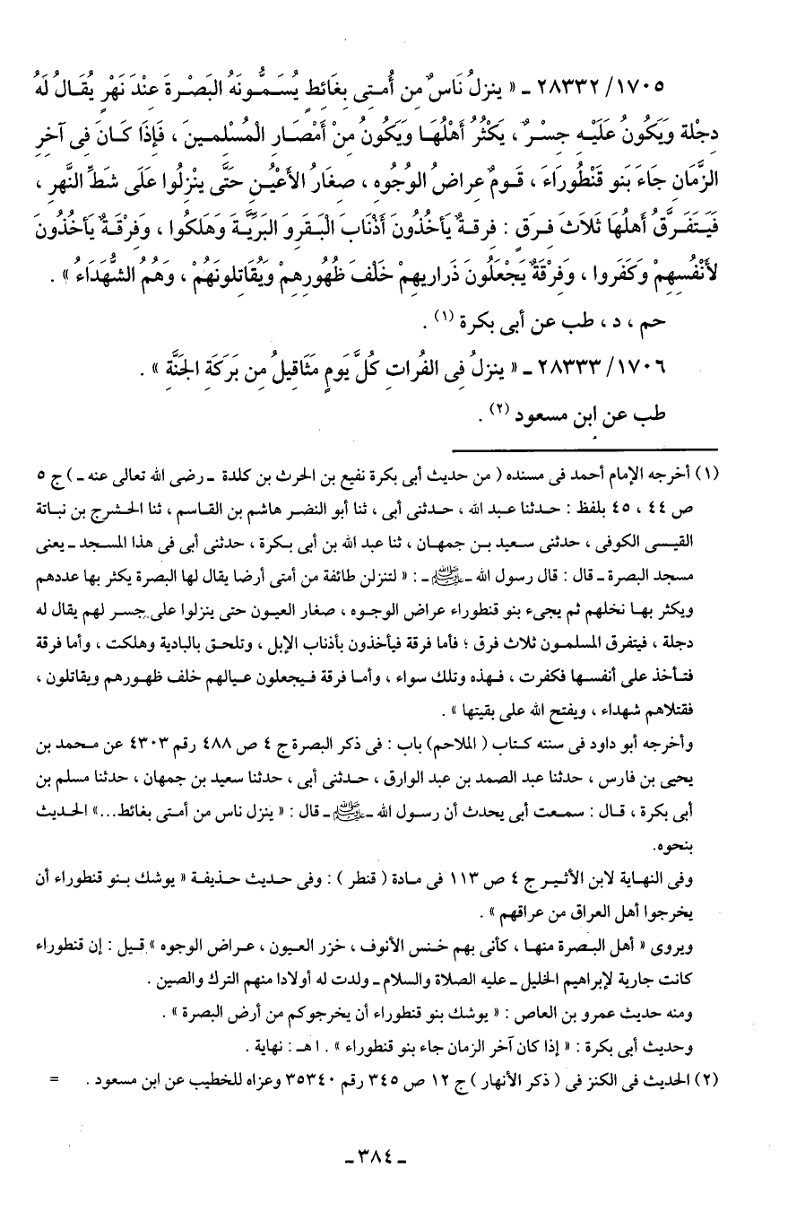 1705/ 28332 - "ينزلُ نَاسٌ مِن أُمتِى بِغَائِط يُسَمُّونَهُ البَصْرةَ عِنْدَ نَهْرٍ يُقَالُ لَهُ دِجْلة وَيَكُونُ عَلَيْهِ جِسْرٌ، يَكْثُرُ أَهْلُهَا وَيَكُونُ مِنْ أَمْصَارِ المُسْلمينَ، فَإِذَا كَانَ فِى آخِرِ الزَّمَانِ جَاءَ بَنو قَنْطُورَاءَ، قَومٌ عِراضُ الوُجُوه، صِغَارُ الأعْيُنِ حَتَّى ينْزِلُوا عَلَى شَطِّ النَّهرِ، فَيَتَفَرَّقُ أهلُهَا ثَلَاثَ فِرَقٍ: فِرْقَة يَأخُذُونَ أذَنَابَ البَقَرِ وَالبَرِّيَّةَ وَهَلَكُوا، وَفِرْقَةٌ يَأخُذُونَ لأنْفُسِهِمْ وَكَفَروا، وَفِرْقَةٌ يَجْعَلُونَ ذَراريهِمْ خَلفَ ظُهُورِهِمْ وَيُقَاتِلونَهُمْ، وَهُمُ الشُّهَدَاءُ".