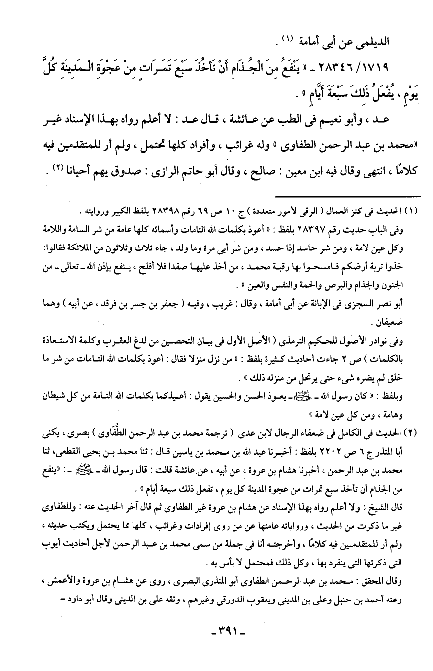 (¬2) الحديث في الكامل في ضعفاء الرجال لابن عدى (ترجمة محمد بن عبد الرحمن الطُّفَاوى) بصرى، يكنى أبا المنذر جـ 6 ص 2202 بلفظ: أخبرنا عبد اللَّه بن محمد بن ياسين قال: ثنا محمد بن يحيى القطعى، ثنا محمد بن عبد الرحمن، أخبرنا هشام بن عروة، عن أبيه، عن عائشة قالت: قال رسول اللَّه -صلى اللَّه عليه وسلم-: "ينفع من الجذام أن تأخذ سبع تمرات من عجوة المدينة كل يوم، تفعل ذلك سبعة أيام".