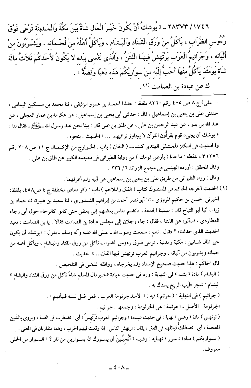 1746/ 28373 - "يُوشِكُ أَنْ يَكُونَ خَيْرَ المَالِ شَاةٌ بَيْنَ مَكَّةَ وَالمَدِينَةِ تَرْعَى فَوْقَ رُءُوسِ الظِّرَابِ، يَأكُلُ مِنْ وَرَقِ القَتَاد وَالبَشَامِ، وَيَأكُلُ أَهْلُهُ مِنْ لُحْمَانه، وَيَشْرَبُونَ مِنْ أَلبَانِهِ، وَجَرَاثِيمُ الْعَرَبِ يَرْتَهِشُ فِيهَا الفَتَنُ، وَالَّذِى نَفْسِى بيَدِهِ لا يَكُونُ لأَحَدِكمْ ثَلَاثُ مِائَة شَاةٍ يَوْمَئَذٍ يَأْكُلُ مِنْهَا أَحَبُّ إِلَيْهِ مِنْ سِوَاريِّكُمْ هَذِهِ ذَهبًا وَفِضَّةً".